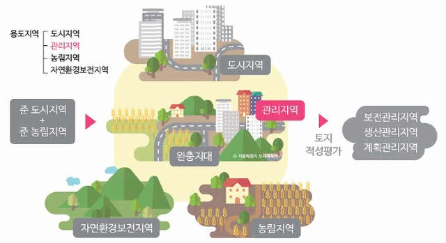 관리지역은 도시지역과 농림지역(또는 자연환경보전지역)의 중간적인 성격이라고 보면 됩니다.