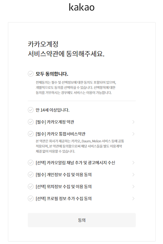 약관을 확인하고 동의하면 새로운 카카오 계정이 만들어 집니다.