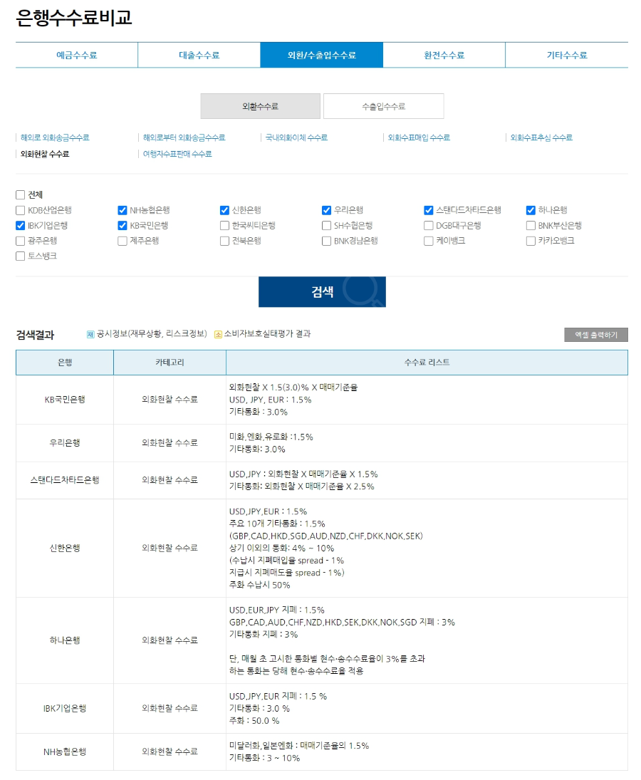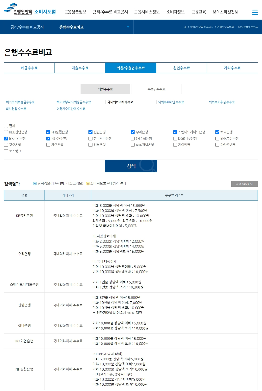 국내외화이체 수수료는 아래와 같이 은행연합회 소비자포털에서 조회가 가능합니다.