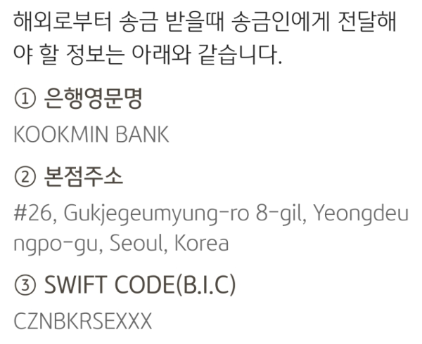 KB국민은행 영문명과 SWIFT CODE는 아래 이미지 참고하세요.