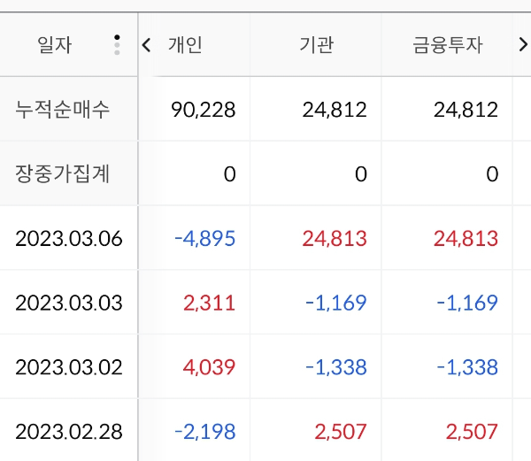 개인, 외국인은 팔고, 기관이 샀네요.