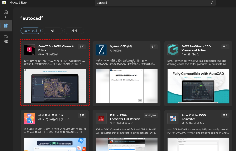 마이크로소프트 스토어(Microsoft Store)에 들어가서 오토캐드를 검색하면,