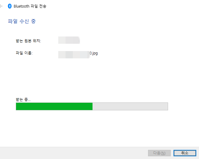 블루투스 연결이 되고나면, 아래와 같이 파일 전송이 시작됩니다.