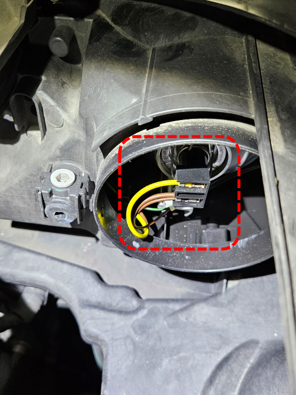그 후에 전조등 안 쪽을 보면 동그란 고무마개가 보이고 고무마개를 제거하면 아래와 같이 전선이 연결되어 있는 전구를 볼 수 있습니다.