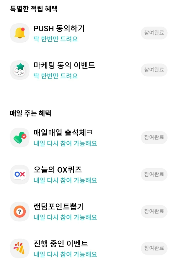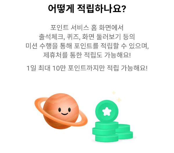 출석체크, 퀴즈, 둘러보기 등 미션을 수행하면 포인트를 적립해 주는데요.