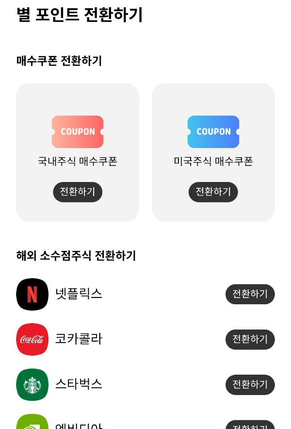 별 포인트 전환하기를 통해 국내주식이나 미국주식 매수쿠폰으로 변경할 수 있고,